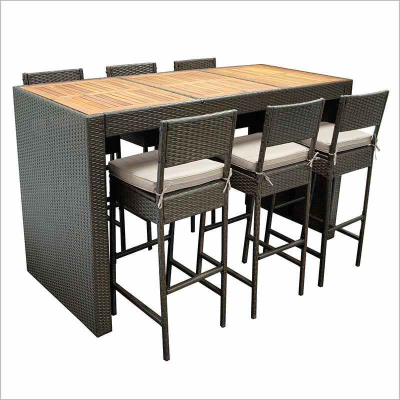 Alle Teile mit robustem Metallgestell und brauner Polyrattan-Bespannung. Tischplatte aus Akazienholz geölt.